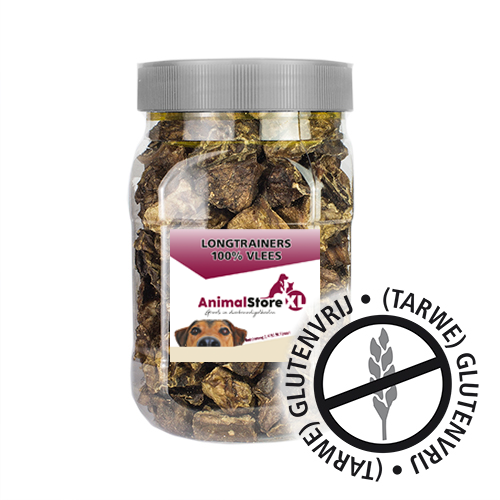 Traktatie voor honden. Een afsluitbare pot vol blokjes longtrainers. Het perfecte hapje tijdens trainingen en als beloning.