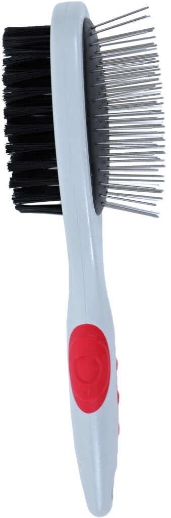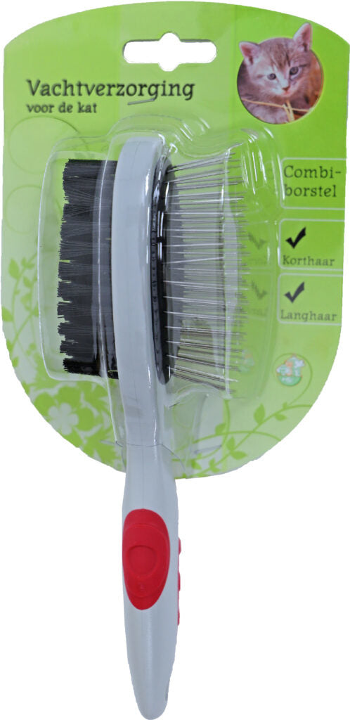 De Combi 2‑Zijdig Borstel – Small Kat is geschikt voor zowel kort- als langharige katten. Met nylon haren aan de ene kant en flexibele stalen haren aan de andere kant verwijdert hij los haar en vuil zonder de huid te irriteren. Perfect bij huizen met meerdere katten!