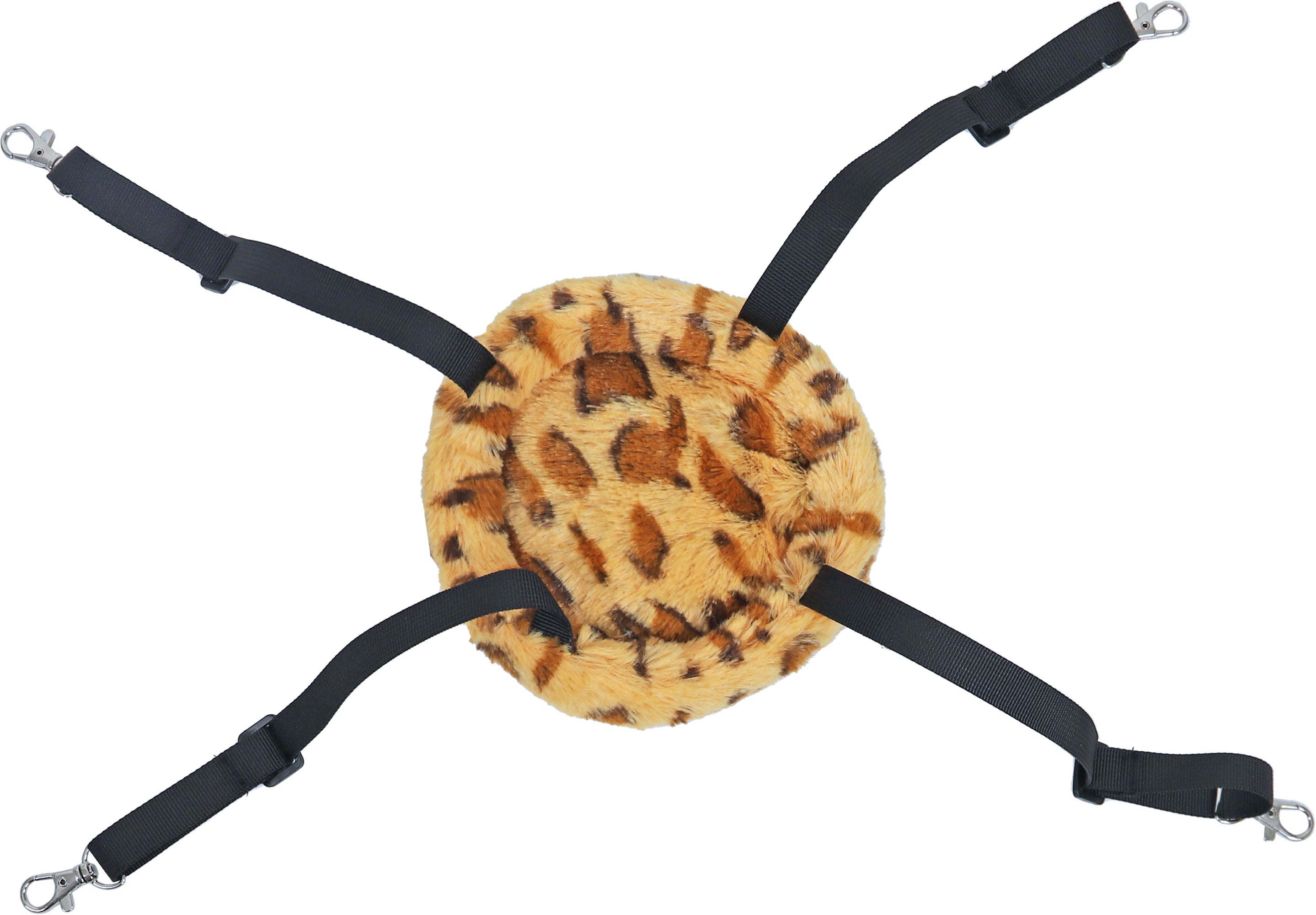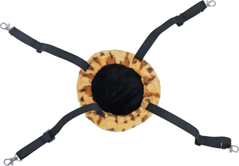 De Boon hangmand in luipaardprint is een warme, comfortabele rustplek voor jouw knaagdier. Dankzij de vier verstelbare nylon banden met stevige metalen karabijnhaken is de mand makkelijk te bevestigen aan elke kooi. Het omkeerbare kussen biedt variatie: een stoere luipaardprint aan de ene kant en zachte zwarte pluche aan de andere.