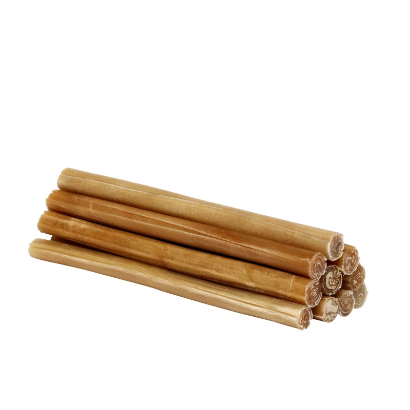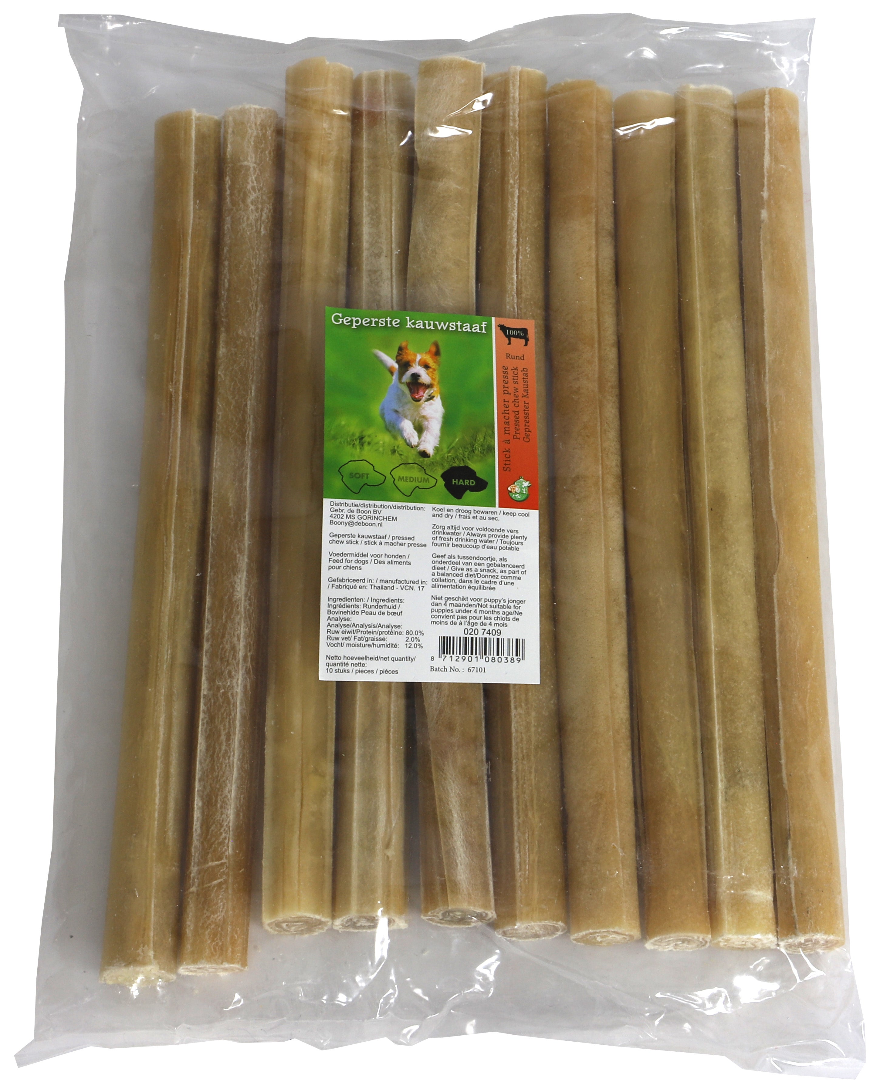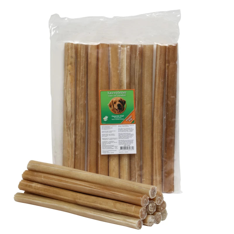 Deze zware kauwstaven van buffelhuid zijn geperst en uit Thailand geïmporteerd—100% natuurlijk en perfect om tandverzorging te stimuleren. Met een lengte van 25 cm zijn ze ideaal voor actief kauwen door middelgrote honden. Verpakt per 10 staven, en er is een voordelige doos met 20 zakken beschikbaar.