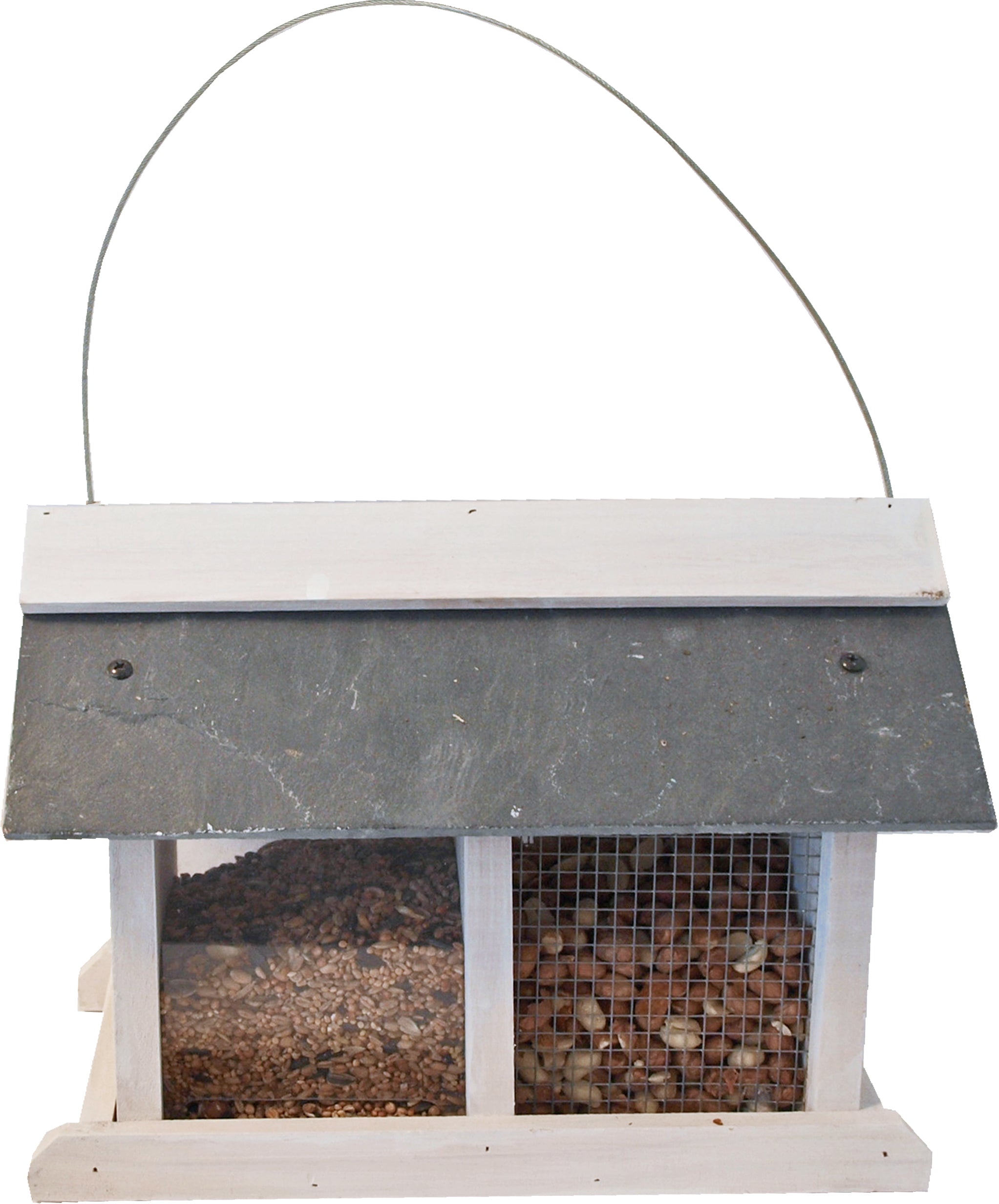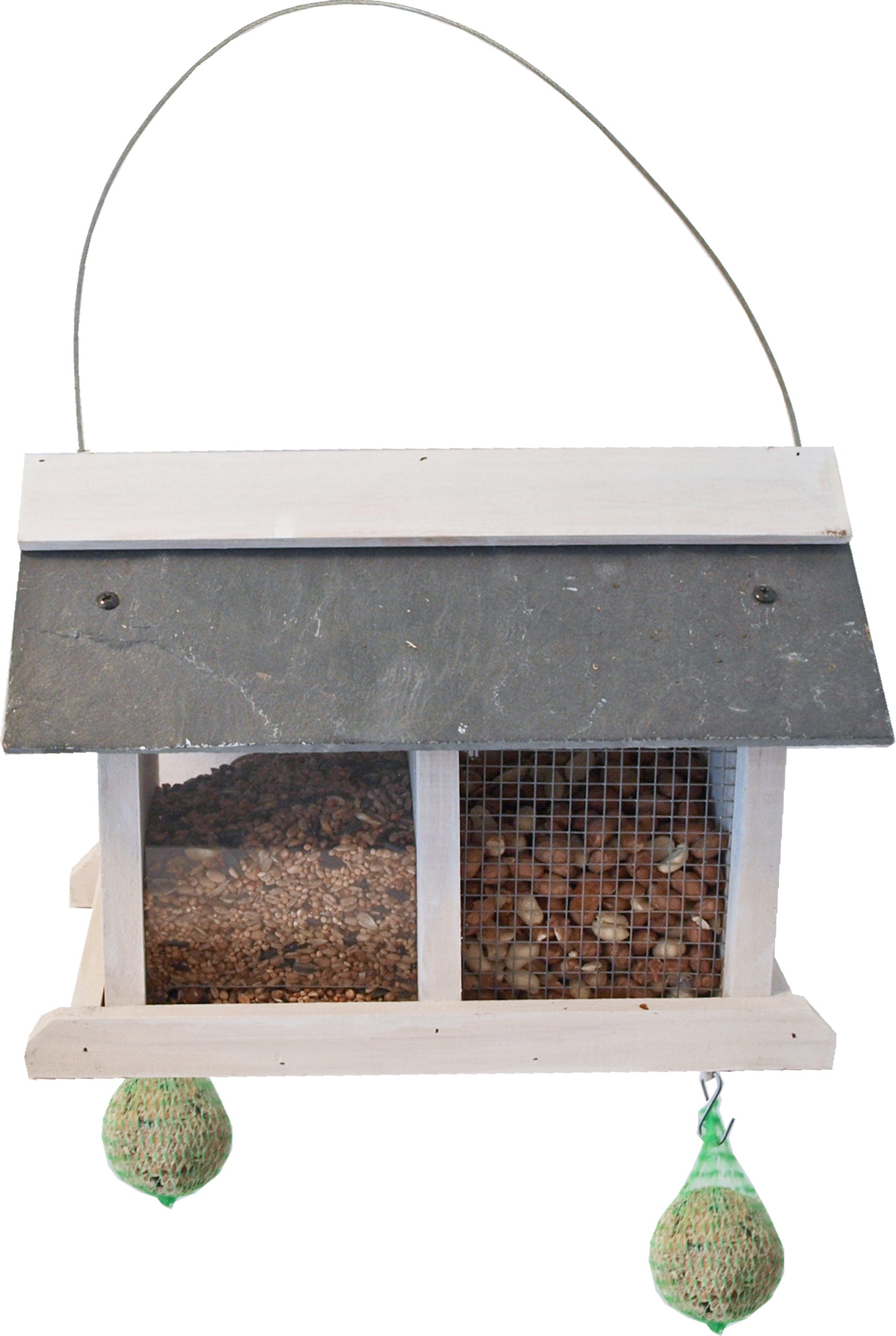 Dit hangbare voederstation in wit met leisteen puntdak is een prachtige toevoeging aan jouw tuin. Met twee aparte voergedeeltes biedt het een ruime en veilige eetplek voor kleine vogels. De stevige metalen ophanglus maakt het eenvoudig te plaatsen.