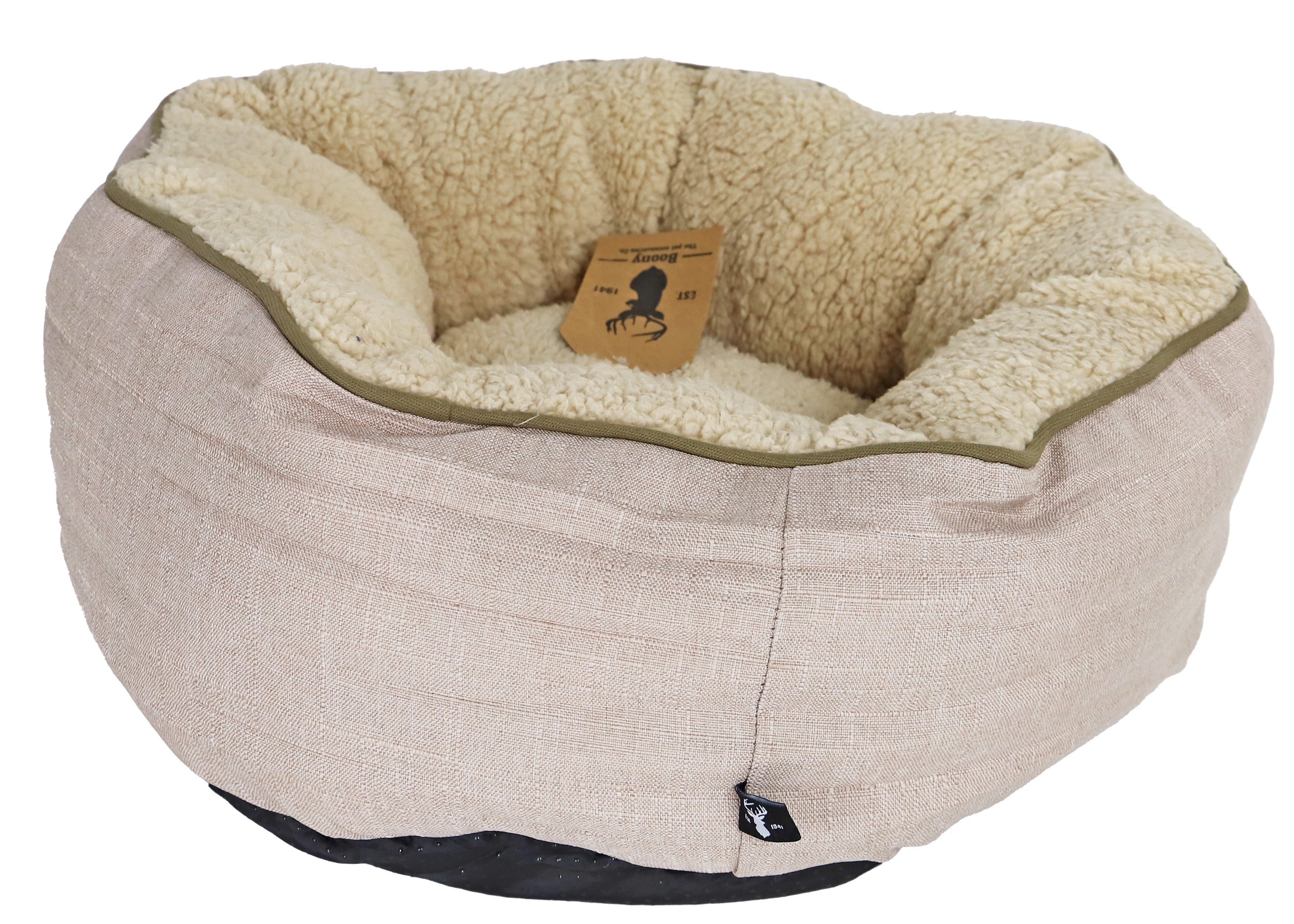 Deze ronde mand is dé plek waar jouw huisdier zich veilig voelt en volledig kan ontspannen. De Boony Floof met zijn verfijnde Highland Sand kleur biedt niet alleen een comfortabele rustplek, maar voegt ook een vleugje luxe toe aan je interieur. De zachte schapenwolstructuur en verhoogde randen zorgen voor geborgenheid en ondersteuning.