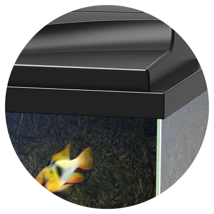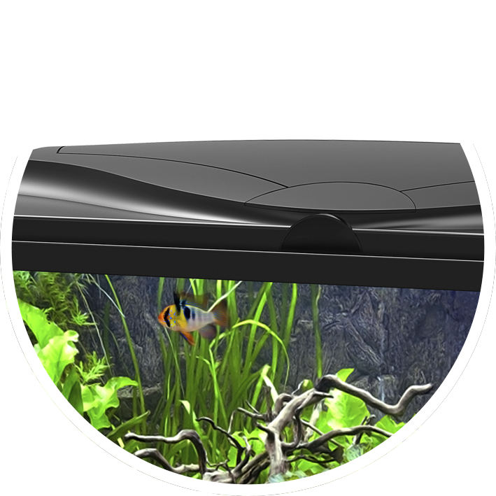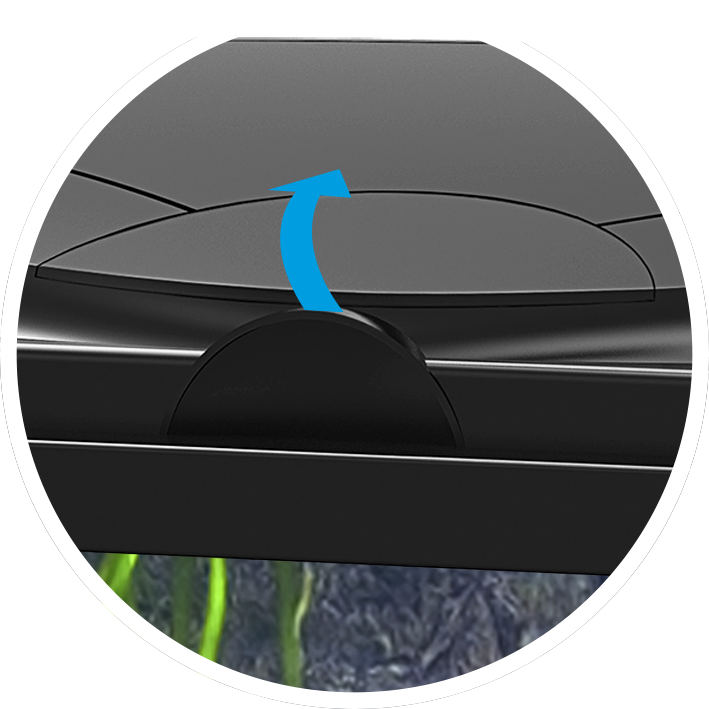De Ciano Aqua 60 zwart heeft een deksel wat bestaat uit de lichtbalk in het midden met 2 kleppen, de voorste klep heeft een schuifje geïntegreerd waar gemakkelijk een voederautomaat op de plaatsen is.