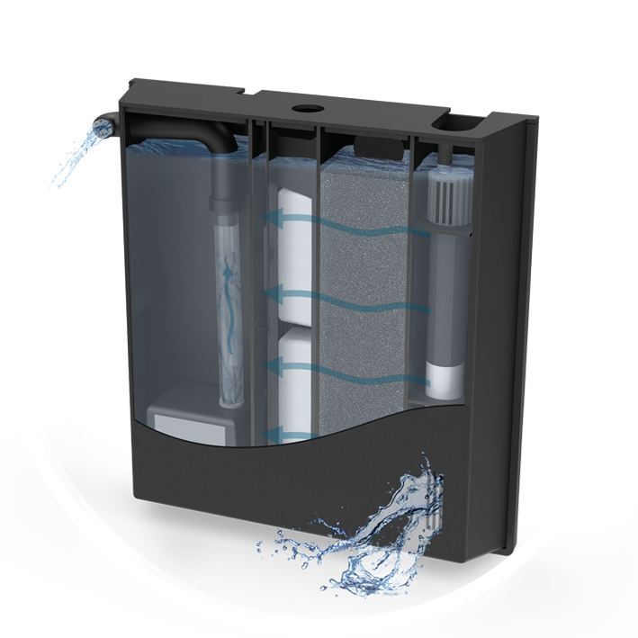 Het binnenfilter is naar wens te plaatsen en zit dus niet vast gekit, wat een voordeel is met het plaatsen van bijvoorbeeld een achterwand- poster of wanneer er een overstap wordt gemaakt op een buitenfilter.