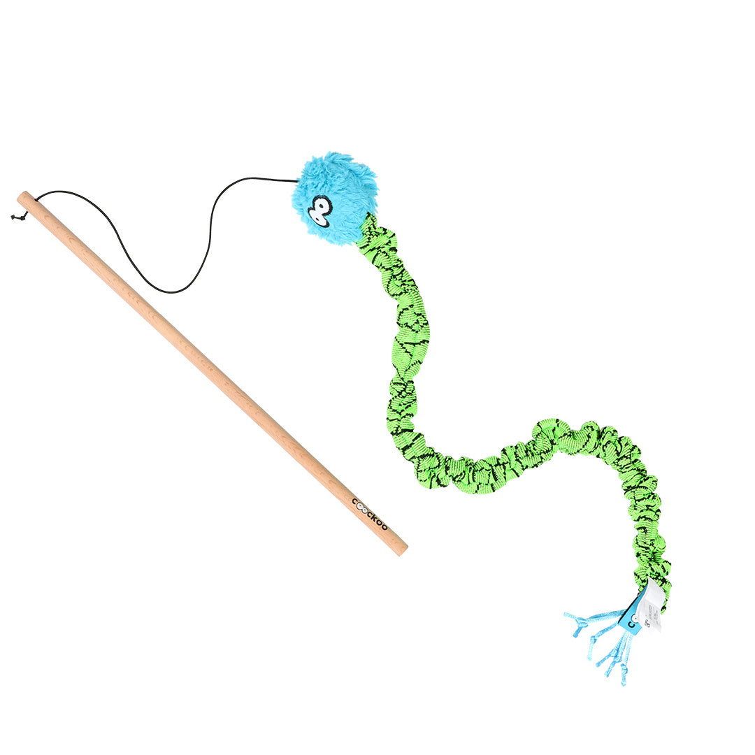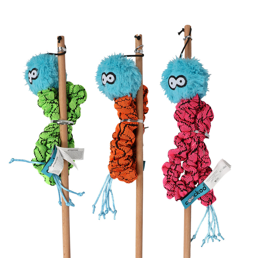 Speelhengel voor katten met een extra lang speelbeestje. De kleur die je ontvangt is een verassing: oranje, groen of roze.