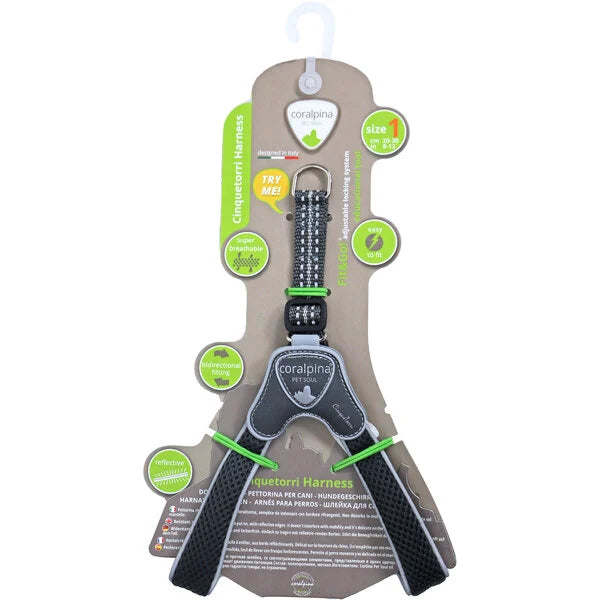 Het Cinquetorri hondenharnas combineert functionaliteit en comfort in een slim ontwerp. Dankzij het FIT & GO-systeem spant het tuig automatisch aan wanneer je hond trekt en ontspant het bij een losse lijn. Dit voorkomt schuren en biedt maximale bewegingsvrijheid. De reflecterende randen zorgen voor extra zichtbaarheid in het donker, en het lichtgewicht materiaal maakt het harnas ideaal voor dagelijks gebruik.