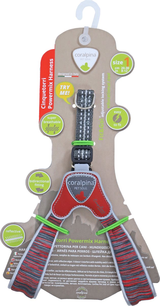 Het Coralpina Powermix harnas combineert comfort, veiligheid en stijl in één ontwerp. Dankzij de waterbestendige en zachte materialen zit het harnas als een tweede huid zonder schuren. De reflecterende randen zorgen voor extra zichtbaarheid in het donker, terwijl de stevige sluiting een veilige pasvorm garandeert. Eenvoudig aan te doen en ideaal voor dagelijkse wandelingen en avonturen.