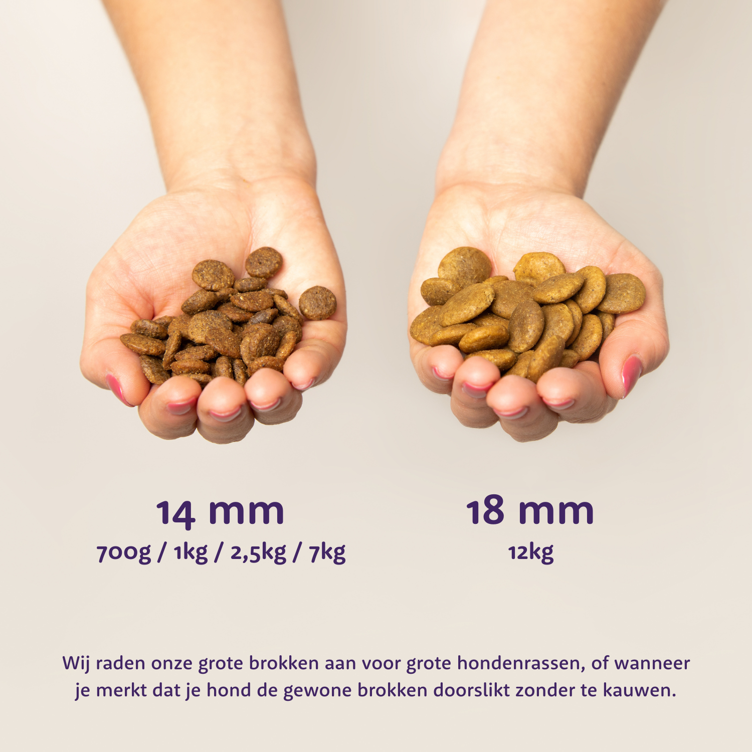 De eerste drie formaten bevatten brokken met een formaat van 14 millimeter. De zakken van 12 kg bevatten brokken met een formaat van 18 mm - uitermate geschikt voor grote hondenrassen of honden die de neiging hebben hun eten in te slikken zonder te kauwen.
