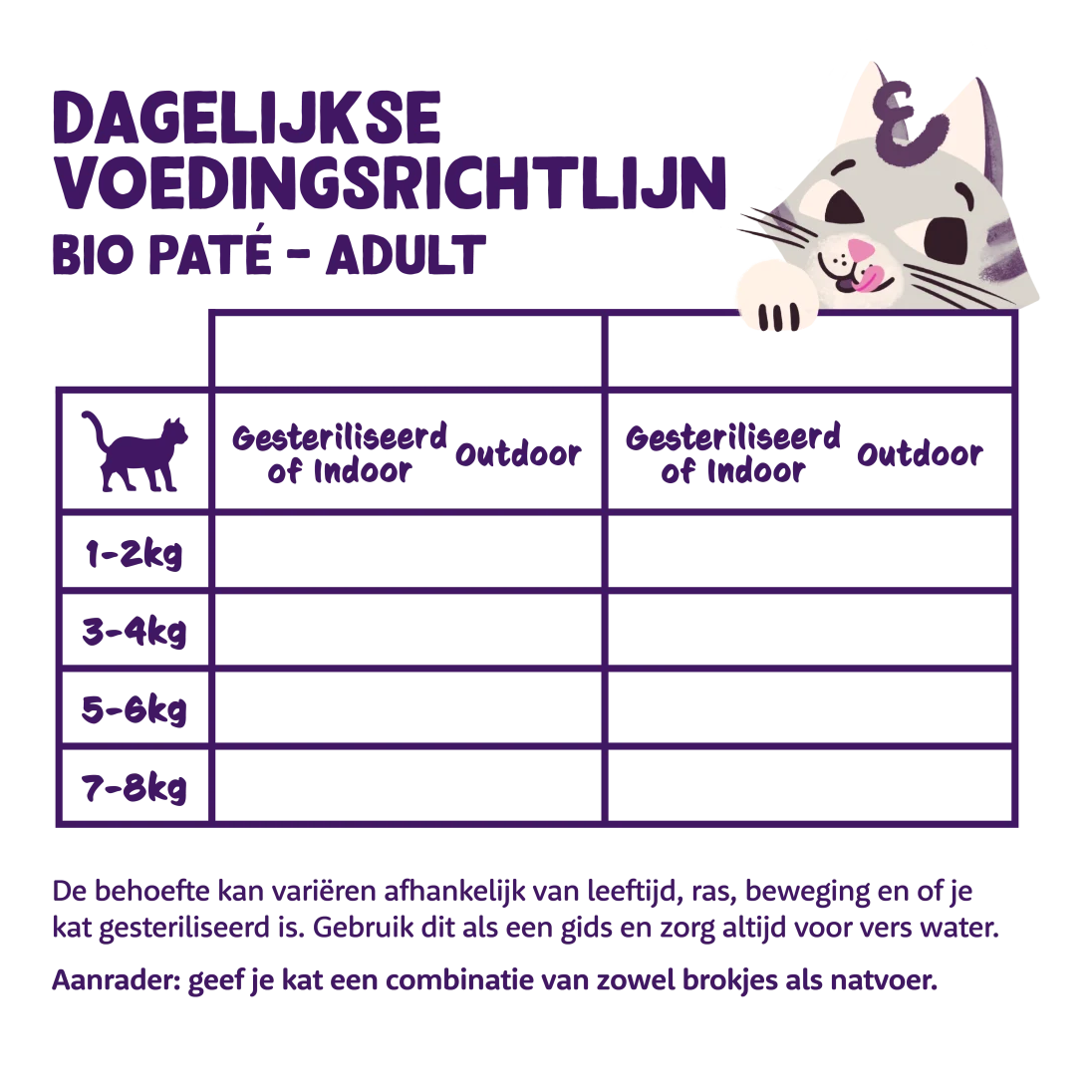 Graanvrij zachtvoer voor (gesteriliseerde) katten. Heerlijk mals vlees, afkomstig van vissen en kippen die veel buitenruimte hebben gehad. Met basilicum, chiazaad en venkel. Aangevuld met taurine voor gezonde ogen en een gezond hart.