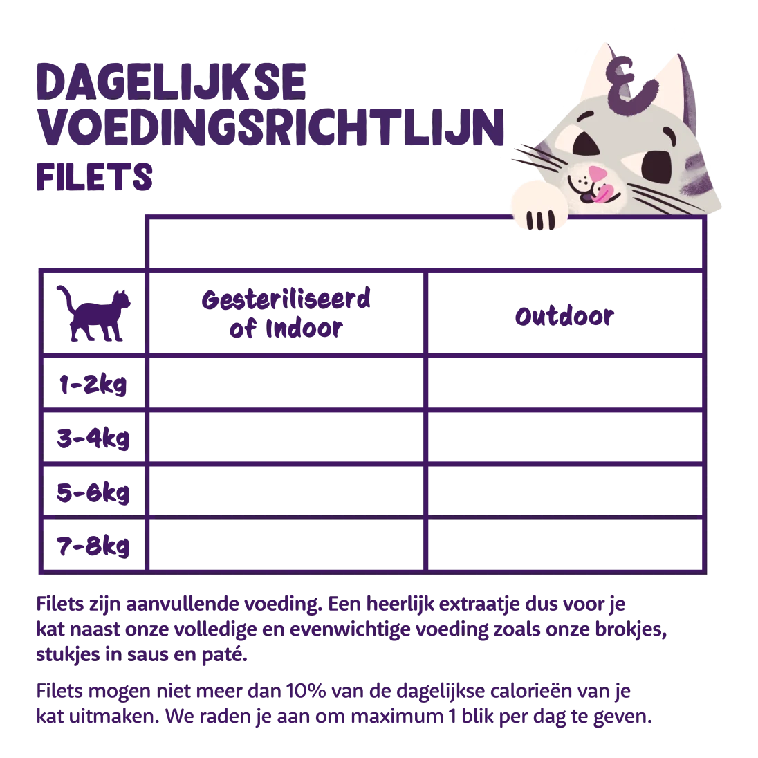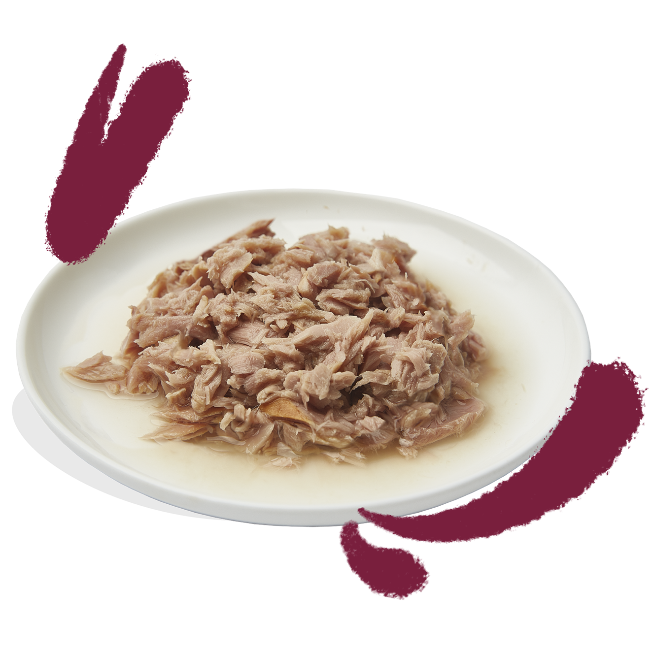 Pure tonijnfilets met kipreepjes en visbouillon, zonder toevoegingen. Voor (gesteriliseerde) katten vanaf 8 weken oud.