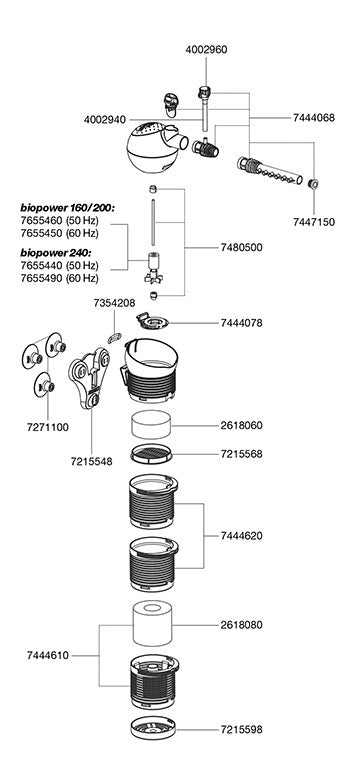 Het bijzondere van biopower is dat het net als een extern filter meerlaagse filtratie biedt. De gesloten filtermanden zijn gevuld met zeer efficiënte filtermedium (bijv.SUBSTRATpro). Onderaan bevindt zich de inlaatkorf met filterpatroon voor de mechanisch-biologische voorfiltratie. Het aan de onderzijde aangezogen water wordt door de verschillende filterlagen naar boven gepompt en na filtratie weer terug in de tank geleid.