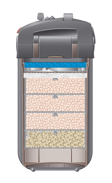 - Groot voorfilter gemakkelijk toegankelijk (direct onder de pompkop) voor snelle verwijdering van mechanische vervuiling zonder het gevoelige biofiltermateriaal te hoeven verstoren