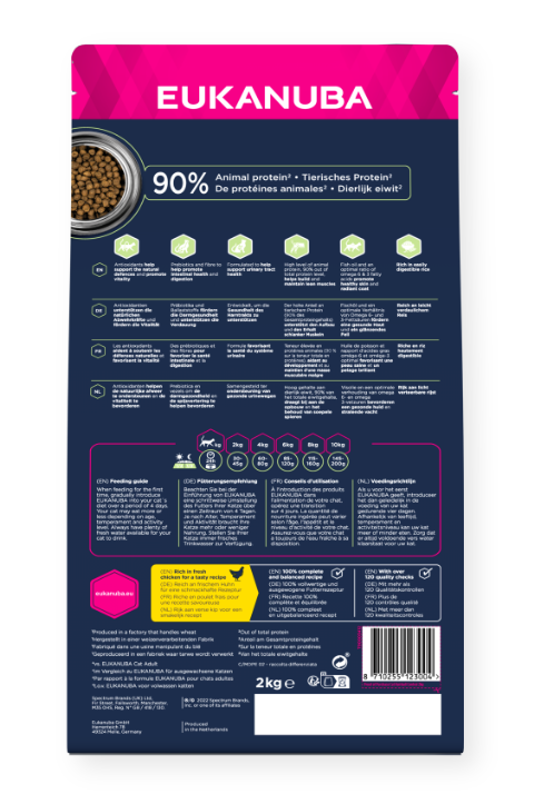 Deze Eukanuba Hairball Control brokjes ondersteunen je kat van binnenuit — met vezels en prebiotica voor een gezonde spijsvertering en 90% dierlijk eiwit voor sterke spieren. Het recept met verse kip helpt haarballen verminderen en zorgt tegelijk voor een glanzende vacht en optimale weerstand. Smakelijk, tarwevrij en compleet.