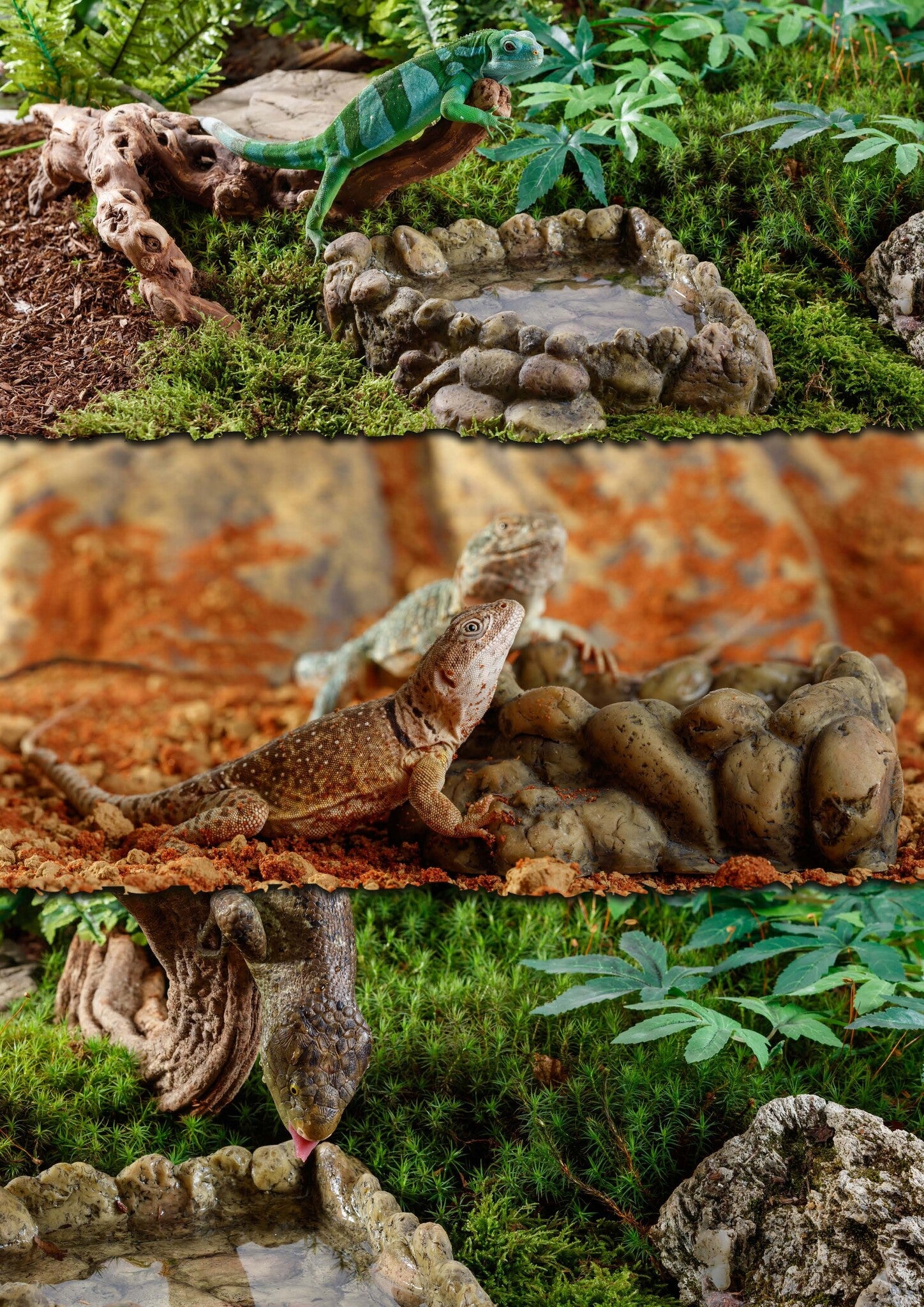 De Exo Terra waterbak heeft een zeer realistische kiezelrots afwerking, wat bijdraagt aan de natuurlijke uitstraling van jouw terrariumlandschap. De neutrale, natuurlijke kleur van de kiezelstenen maakt een gemakkelijke integratie in een woestijn of tropisch terrarium mogelijk. Het ruimtebesparende ontwerp zorgt ervoor dat de waterbak netjes in de hoek van jouw terrarium past. Kleinere reptielen, amfibieën en insecten kunnen gemakkelijk uit de waterbak ontsnappen door de 'veiligheidstreden' in de bak om verdrinking te voorkomen.