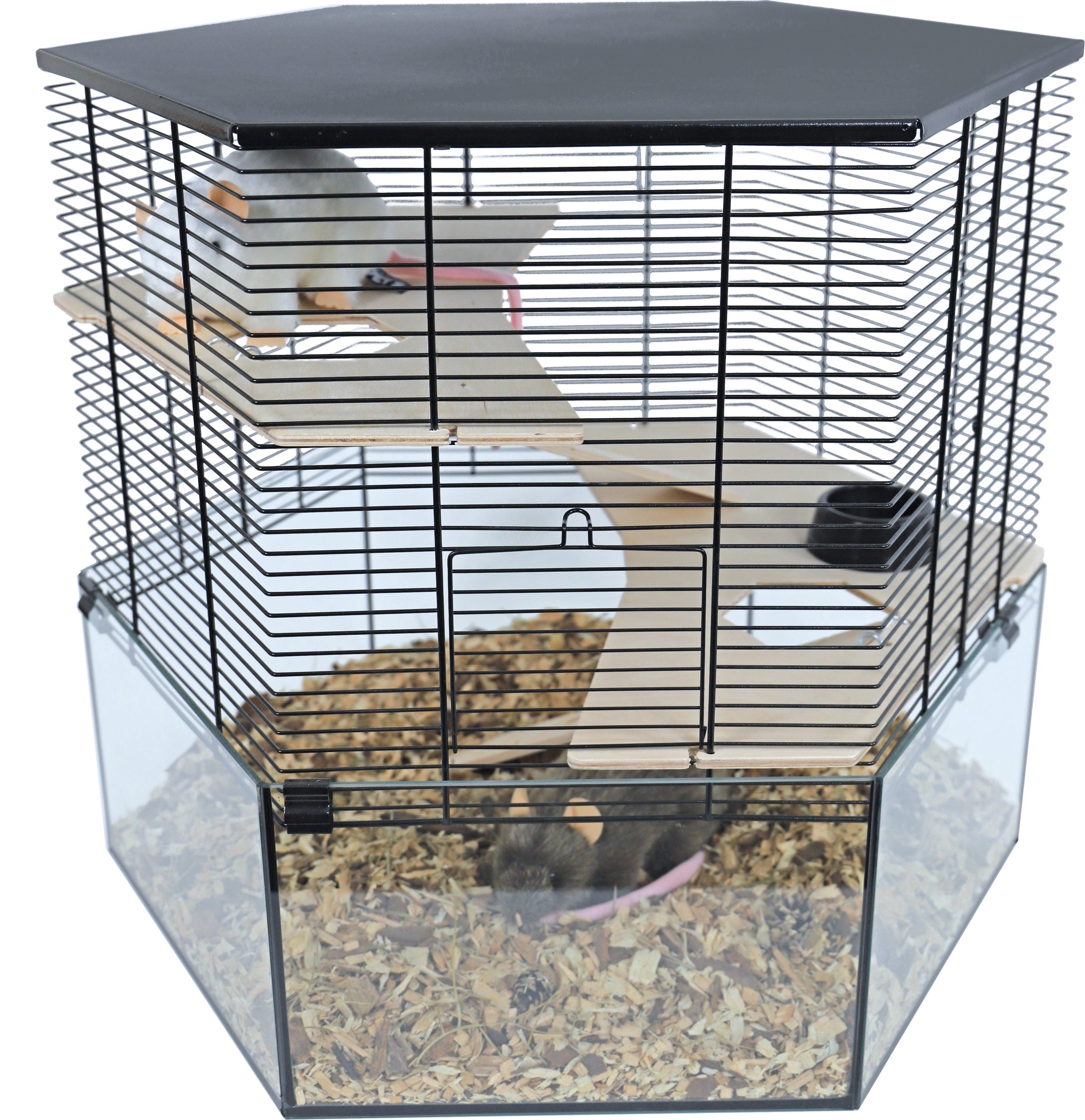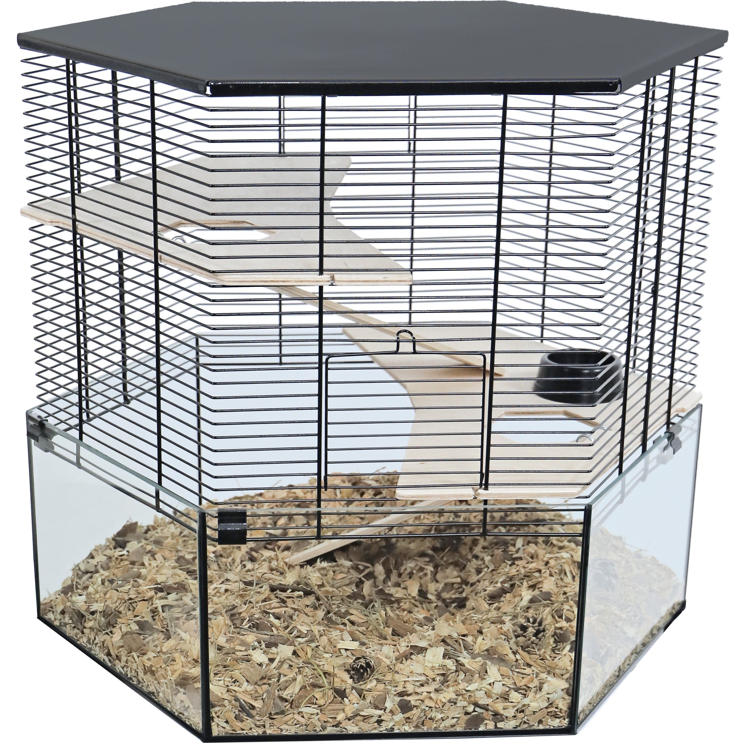 Deze ruime hamsterkooi combineert een moderne, achtkantige vorm met een stevige glazen onderbak. Perfect voor een overzichtelijke en hygiënische leefomgeving voor uw hamster. De glazen onderbak biedt voldoende ruimte voor bodembedekking en voorkomt rommel buiten de kooi.