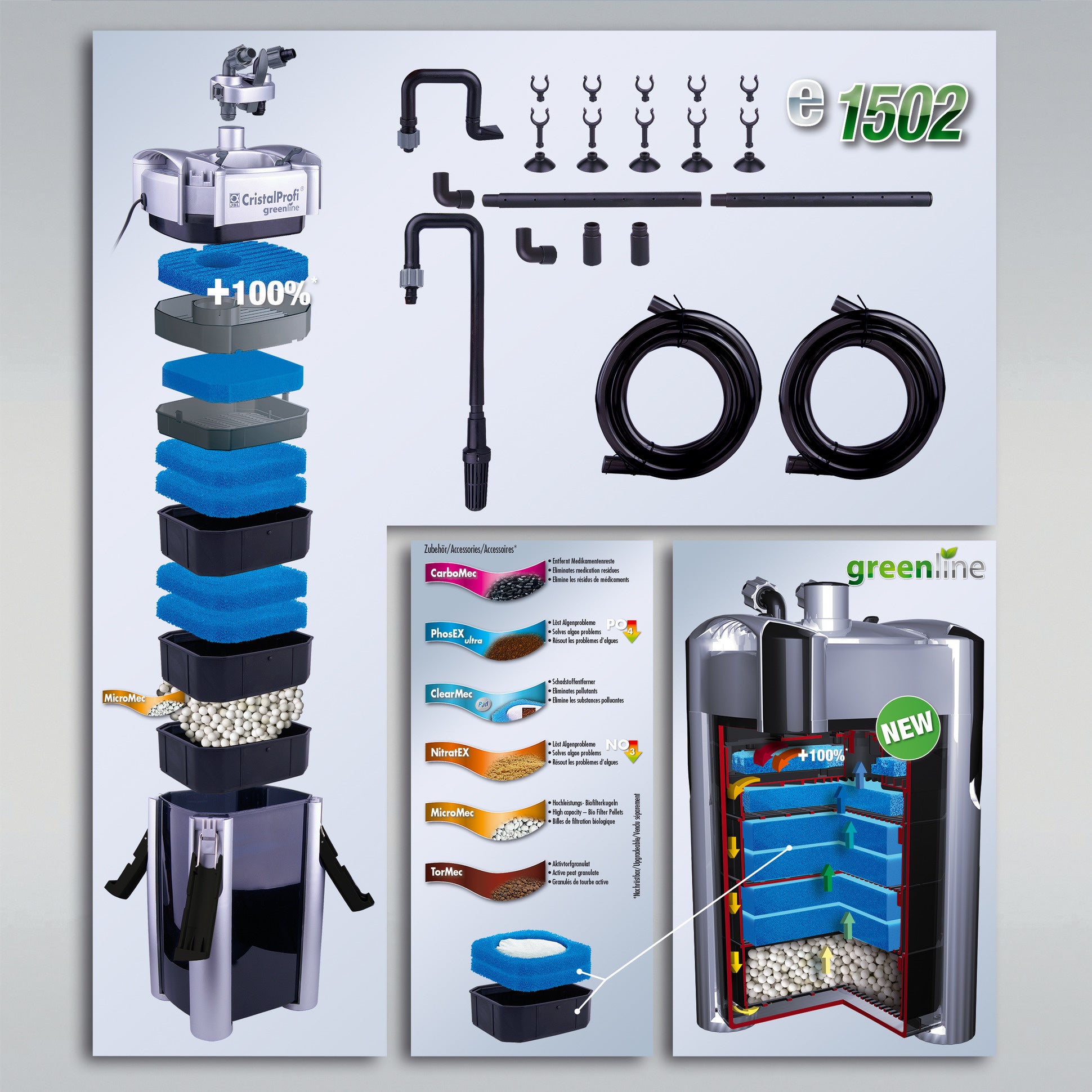 Nieuw: tegenover het voorgaande model, de JBL CristalProfi e1501, is, dat de bovenste filterkorf vernieuwd en efficiënter vormgegeven is: In plaats van kleinere voorfiltermatten in de filterkorf is er nu één dubbel zo grote filtermat als voorfilter. Hierdoor verstopt de filter, ook bij zeer sterke vervuiling, niet zo snel en moet het voorfilter minder vaak gereinigd worden.