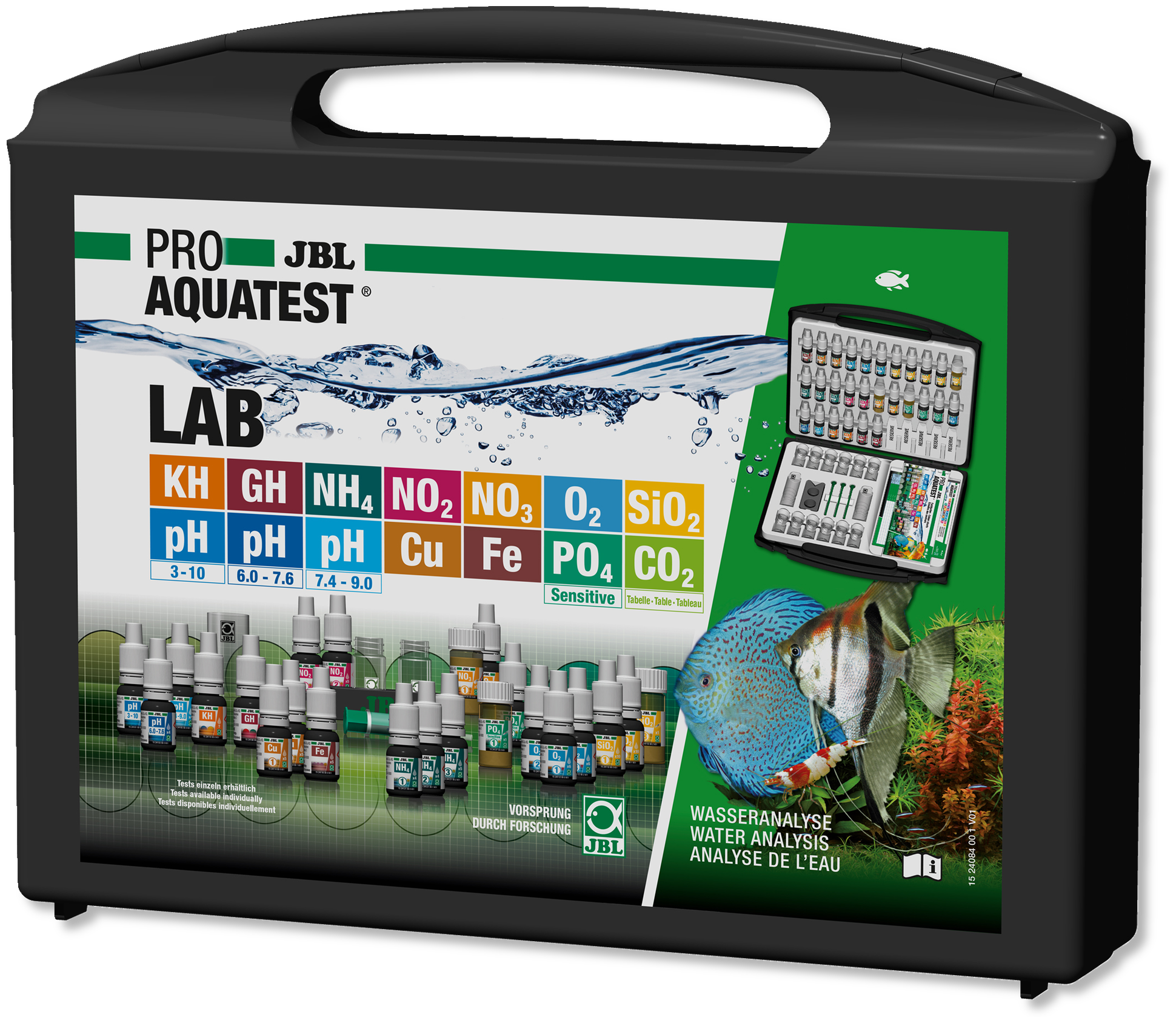 - Eenvoudige en veilige controle van de waterwaarden van aquaria. Bepaling van: PH waarde (3 waardes), carbonaathardheid, gezamenlijke hardheid, ammonium/ammoniak, nitriet, nitraat, fosfaat, ijzer, koper, silicaat, zuurstof en CO2 berekening via tabel