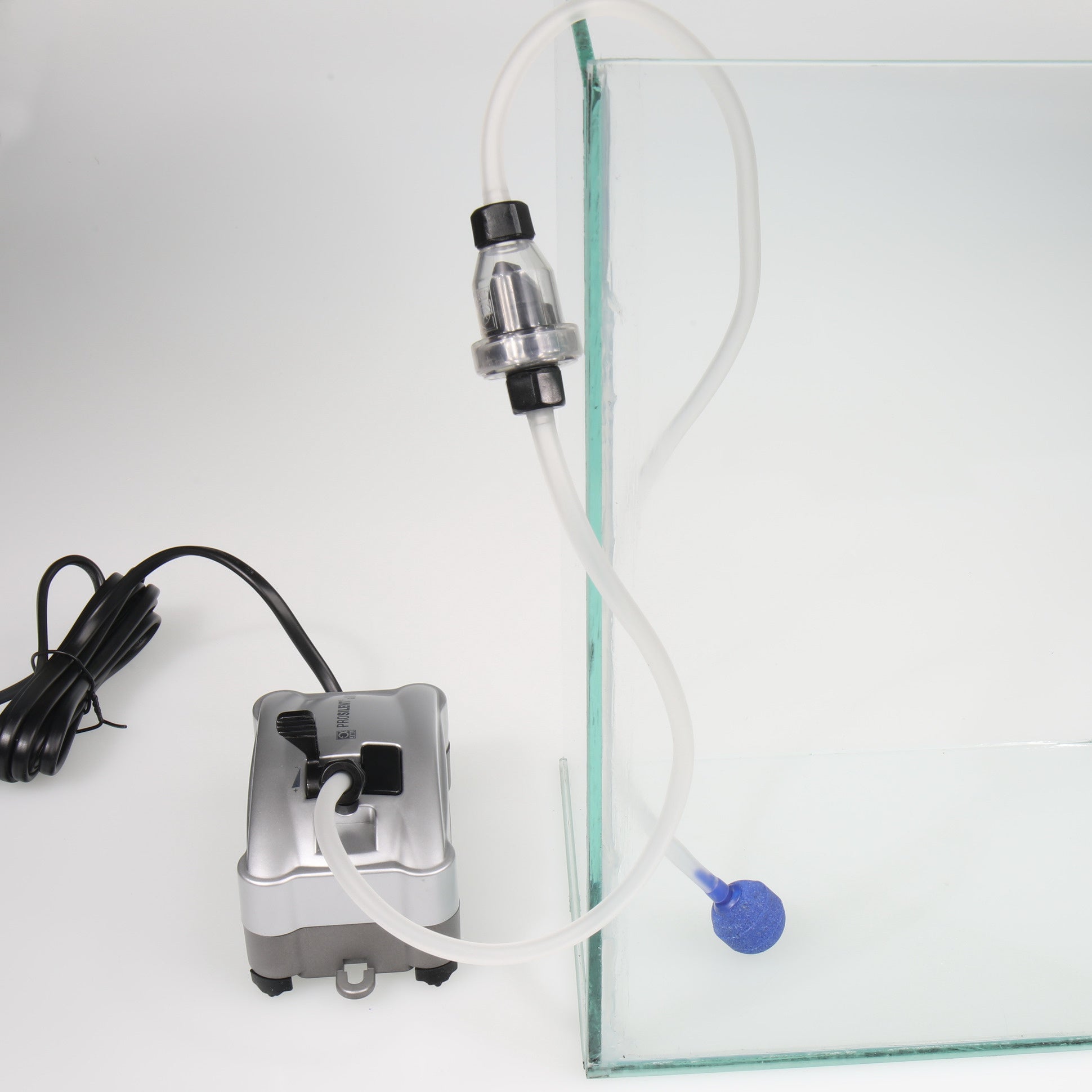 Gereed voor aansluiting met 2 x 2 m slang, 2 terugslagkleppen en 2 uitstroomstenen.
