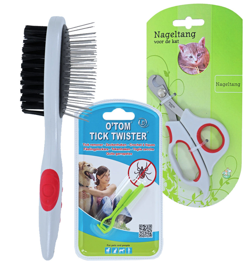 Alles voor een verzorgde kat! Deze bundel bevat een haarborstel, een nageltang en een tekenpen voor uw kat. Helpt u met het verwijderen van vuil, losse haren en parasieten uit de vacht. Met de nageltang knipt u op veilige wijze de te lang geworden nagels van uw kat.