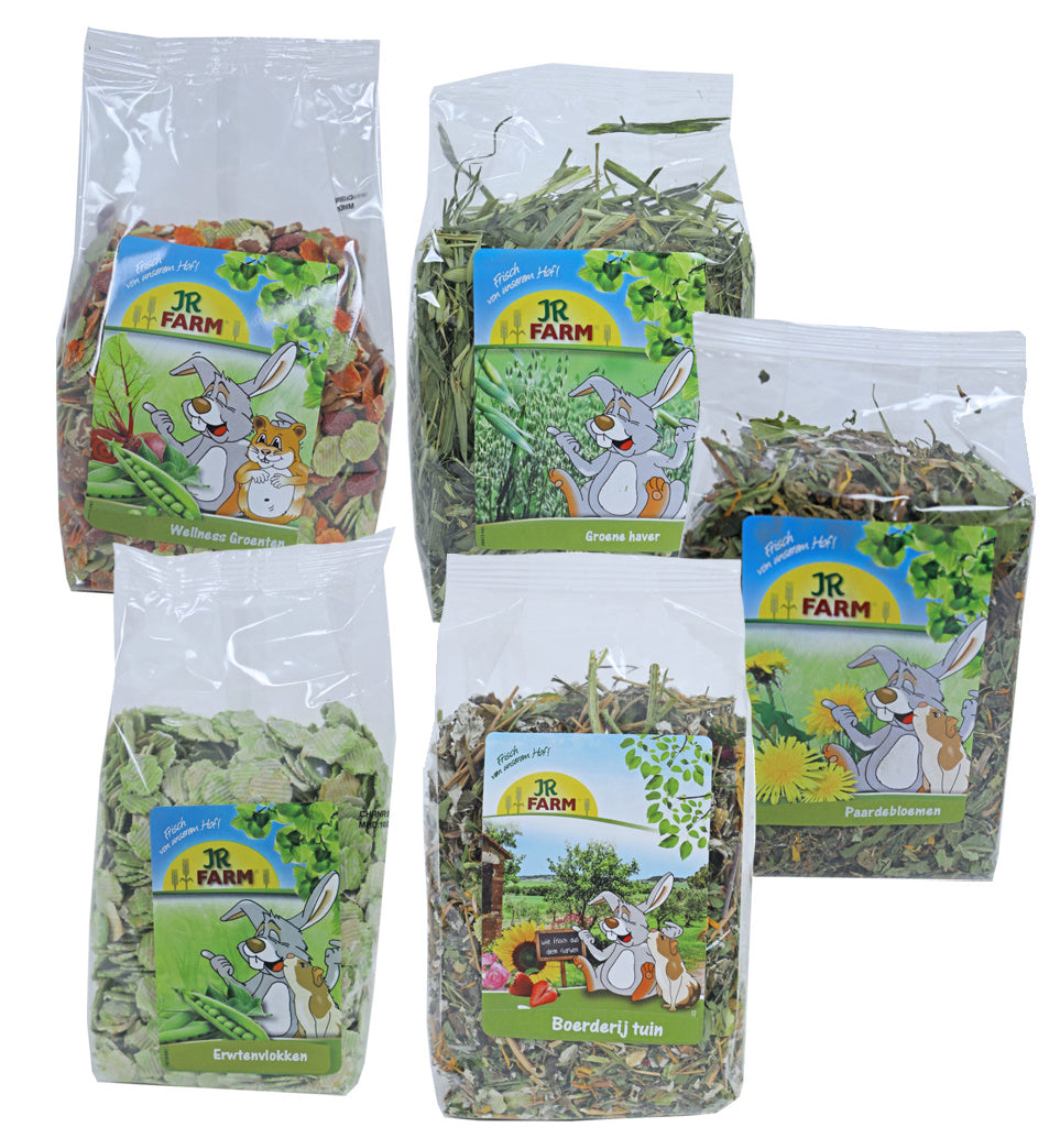 Het voedsel komt vers uit de tuin van JR Farm boerderij. De mix een lekkere traktatie en verwennerij voor knagers. De boerdijer kruidt elk menu met een heerlijke aromatische smaak als aanvullend voer.