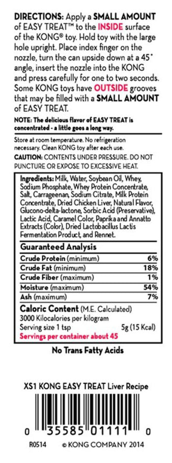 De KONG Easy Treat Leverpastei is een heerlijke, licht verteerbare traktatie voor honden. Deze smaakvolle pasta is ideaal om KONG-speeltjes mee te vullen, zonder gedoe en zonder troep. Met de handige spuitmond bepaal je eenvoudig de hoeveelheid, en voor extra uitdaging vries je de gevulde KONG in!