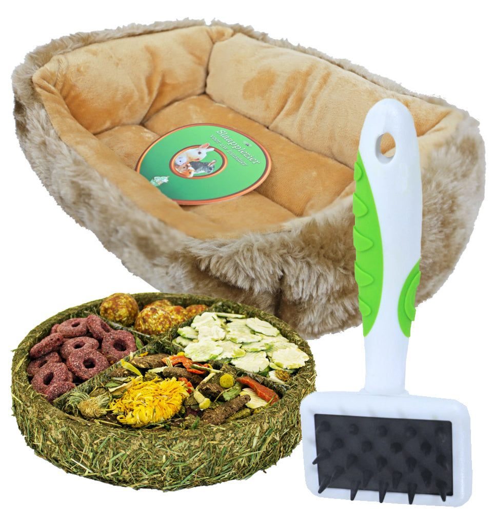 Verwen uw konijn met dit uitgebreide pakket! Met een knus ligbed, een heerlijke massageborstel en luxe hapjes. Geweldig voor uw eigen konijn of om cadeau te geven aan iemand anders met een konijn.