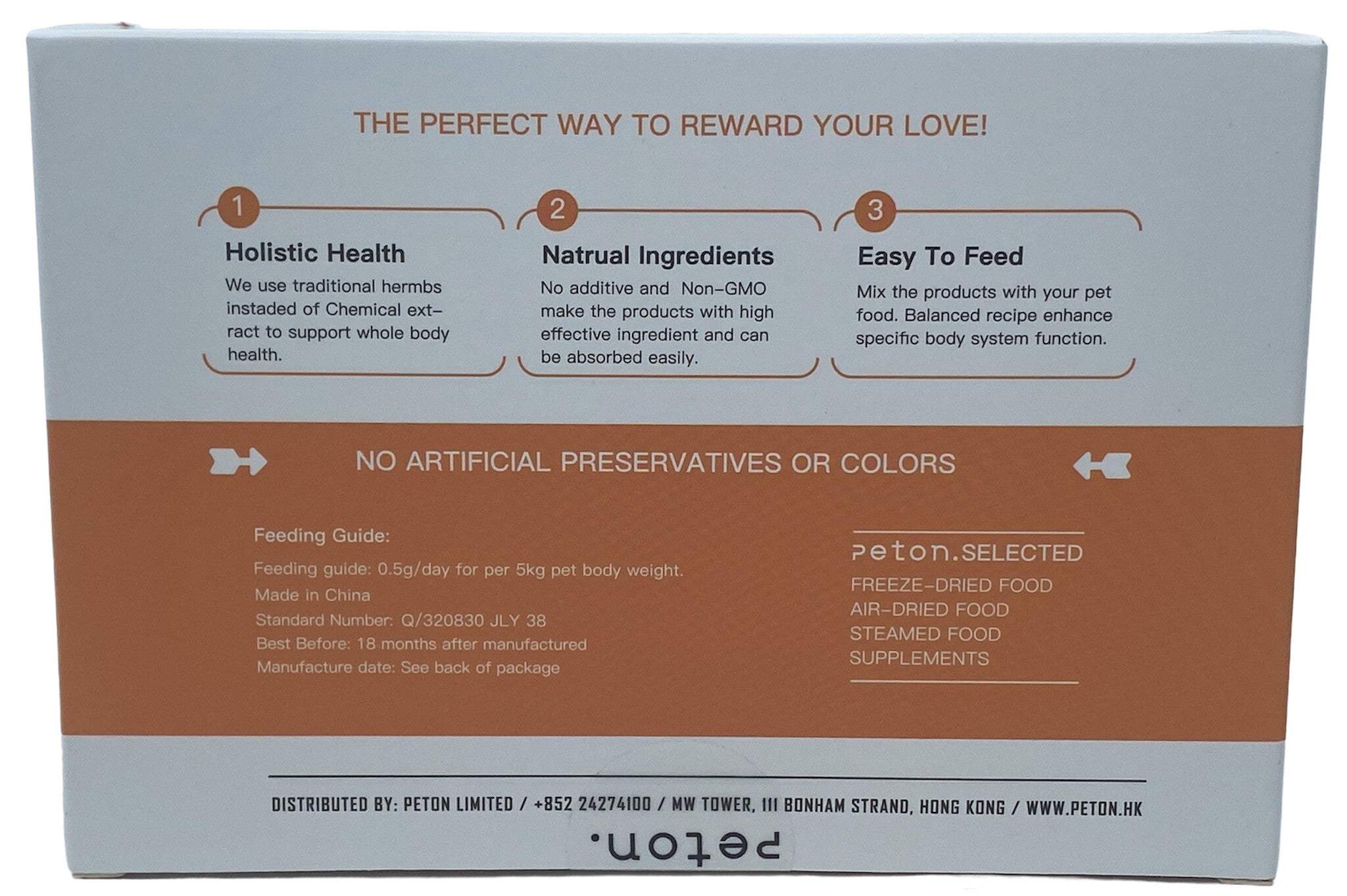 Peton maakt gebruik van vriesdrogen, luchtdrogen of stomen voor een gezonde bewerking en lange houdbaarheid. Gemaakt onder dezelfde strenge eisen als mensenvoeding.