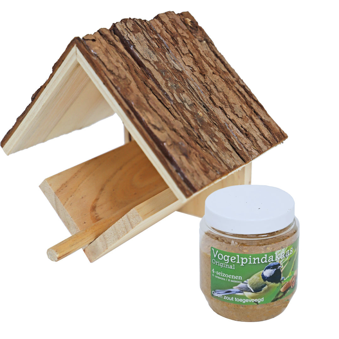 Schattig houten huisje met een bijpassende pindakaaspot. Voer hongerige tuinvogels in de winter bij met een heerlijke pindakaas snack.