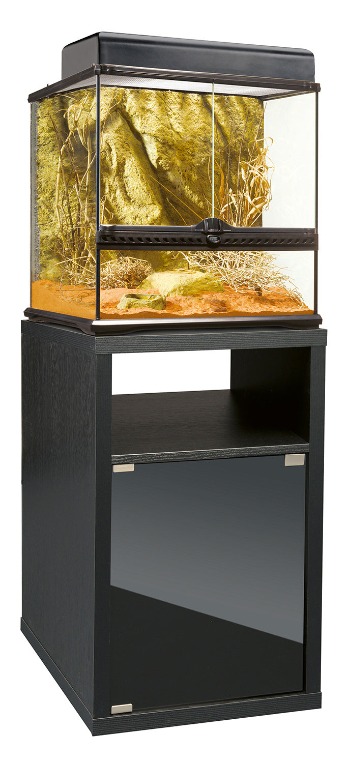 Bij dit terrarium hoort een moderne en elegante kast die stabiliteit en duurzaamheid biedt. De zwarte glazen deuren met magneetsluitingen zorgen voor een strakke, stijlvolle uitstraling en zijn eenvoudig te bedienen. De kast wordt plat verpakt geleverd en is gemakkelijk te monteren, zodat je snel kunt genieten van je nieuwe terrarium uitrusting.
