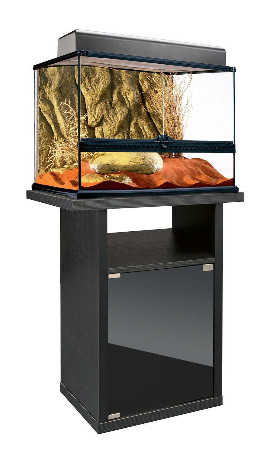 Bij dit terrarium hoort een moderne en elegante kast die stabiliteit en duurzaamheid biedt. De zwarte glazen deuren met magneetsluitingen zorgen voor een strakke, stijlvolle uitstraling en zijn eenvoudig te bedienen. De kast wordt plat verpakt geleverd en is gemakkelijk te monteren, zodat je snel kunt genieten van je nieuwe terrarium uitrusting.