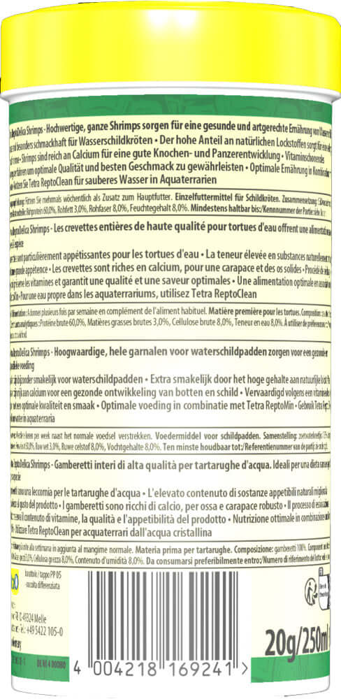 Verwen jouw waterschildpadden met een heerlijke traktatie! Deze garnalen zijn 100% natuurlijk, rijk aan mineralen en dragen bij aan gezonde botten en een sterke schildontwikkeling. Perfect als aanvulling op Tetra ReptoMin schildpaddenvoeding.