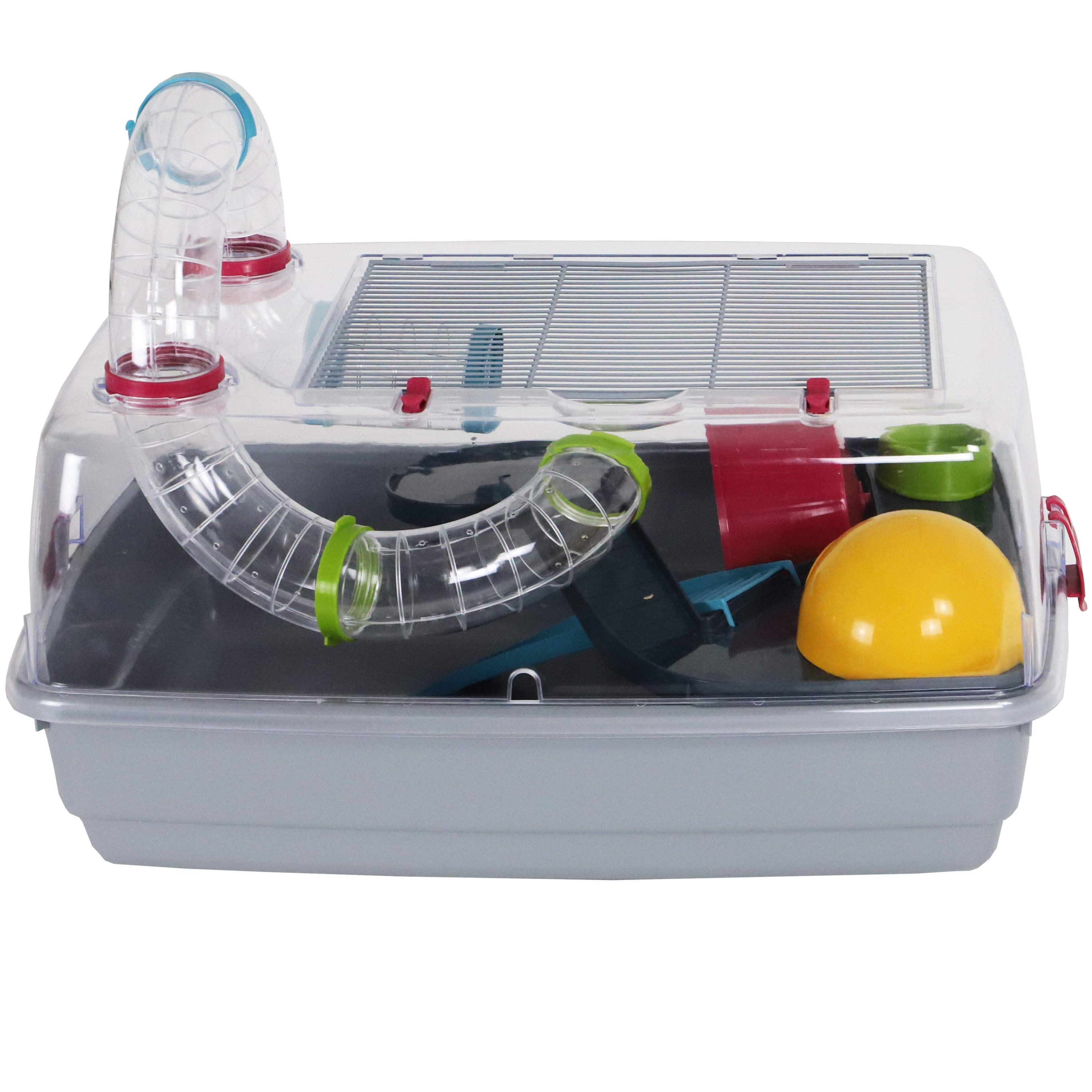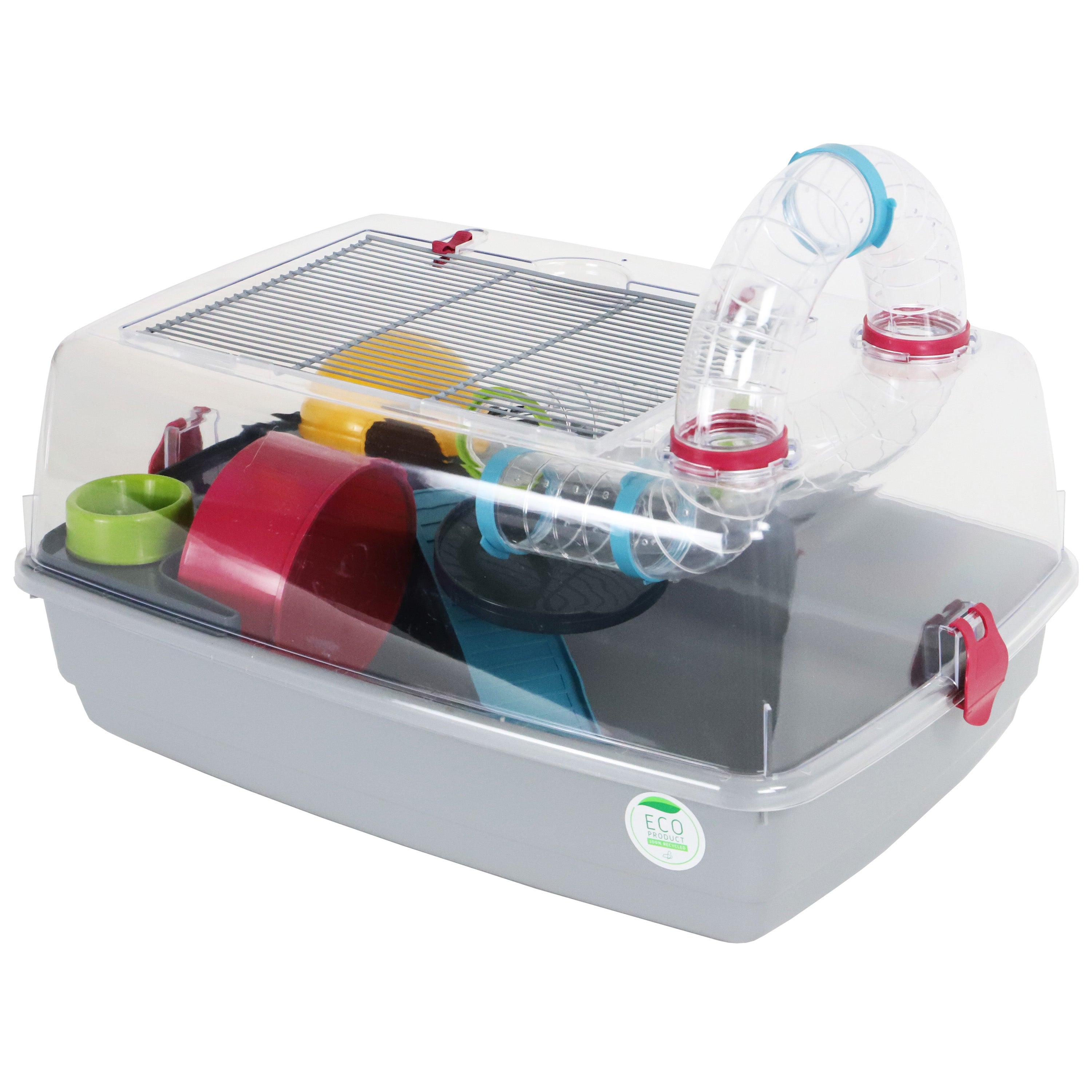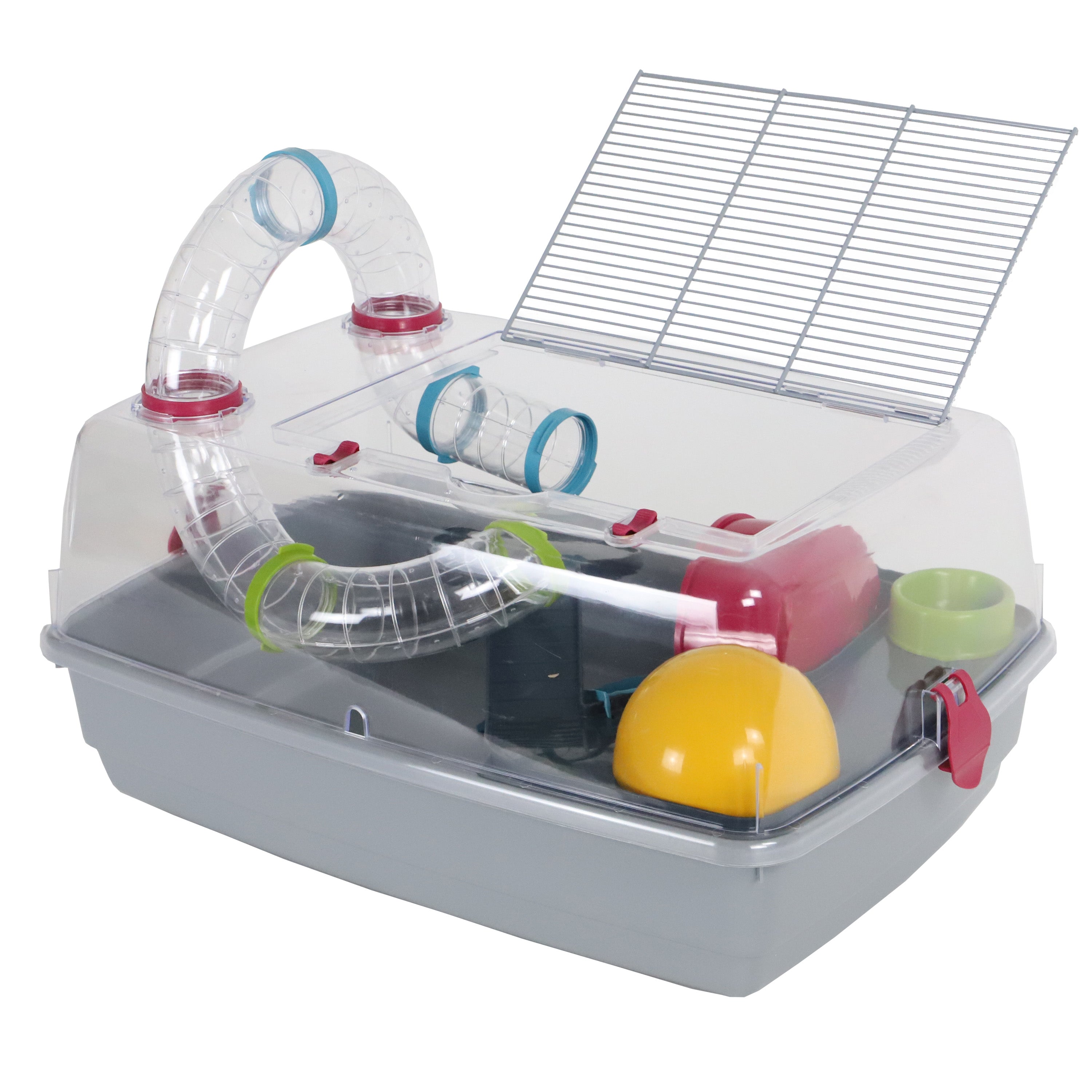 Deze hamsterkooi biedt uw knaagdier een avontuurlijke omgeving met een uitgebreid buizenstelsel binnen en buiten de kooi. Met een verhoogd plateau, een molen voor lichaamsbeweging en een beschut huisje is deze kooi de perfecte plek voor uw hamster om te spelen en te rusten.