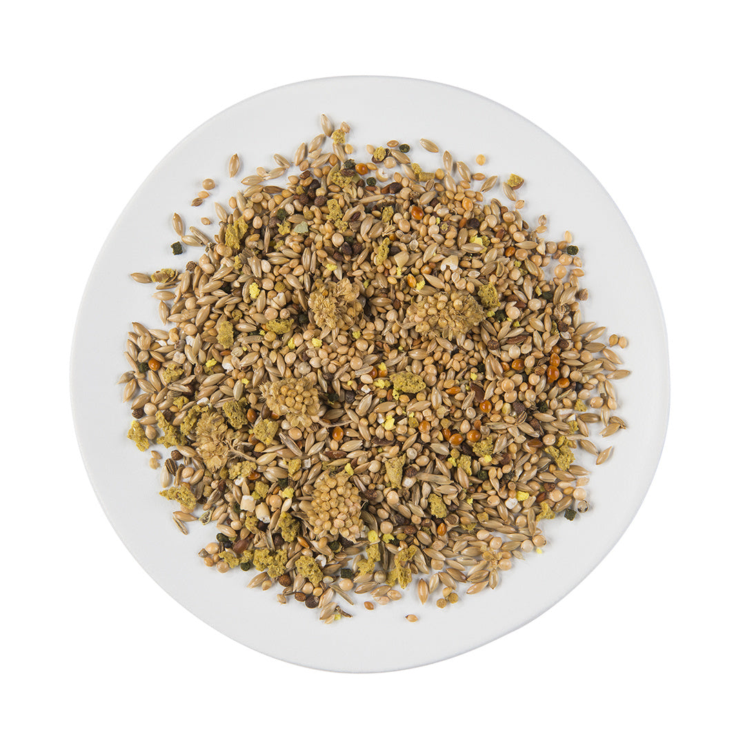 Lijnzaad, appel, saffloorpitjes, trosgierst, ei, oesterschelp, toegevoegde vitamines en sporenelementen.